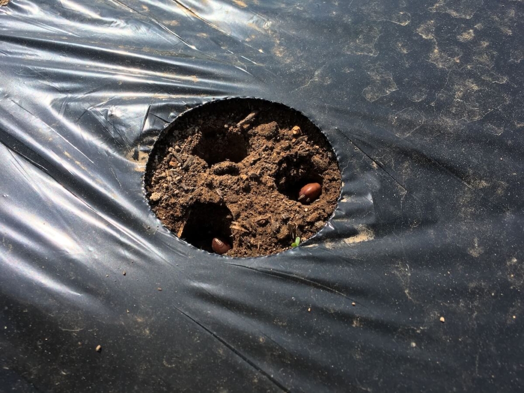 指の第一関節くらいまで軽く穴を開けて、そこに種をまきます。マルチシートの穴ごとに3つずつ植えました。